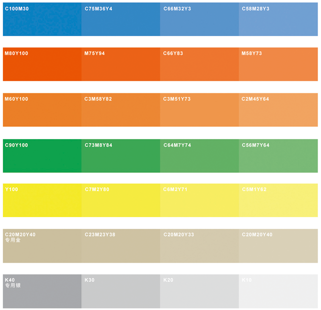 輔助色是企業(yè)標準色的輔助與補充,以適應(yīng)企業(yè)視覺形象的豐富與推廣,適應(yīng)企業(yè)形象的宣傳和應(yīng)用。為使公司形象統(tǒng)一而富有變化特制定輔助色系配合應(yīng)用。
