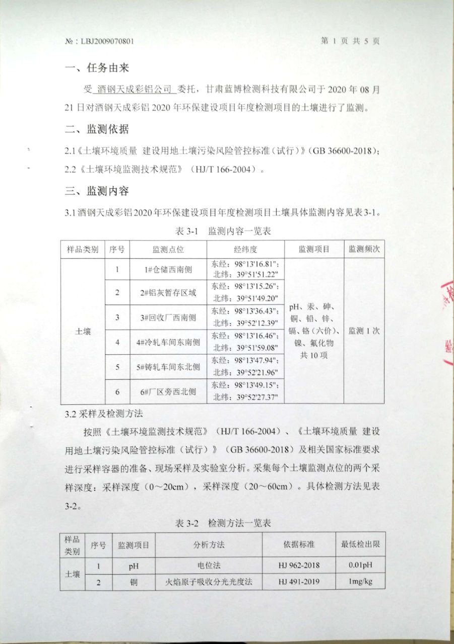 | 監(jiān)測(cè)數(shù)據(jù) | 詳見(jiàn)甘肅酒鋼天成彩鋁有限責(zé)任公司2020年土壤環(huán)境檢測(cè)報(bào)告,批號(hào):LBJ2009070801 | |||