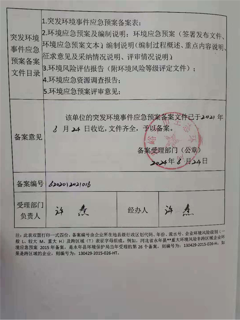 3.風(fēng)險(xiǎn)級(jí)別:[較大-大氣(Q1-M4-E3)+一般-水(Q1-M1-E3)]于2021年6月24日通過嘉峪關(guān)市生態(tài)環(huán)境局備案。