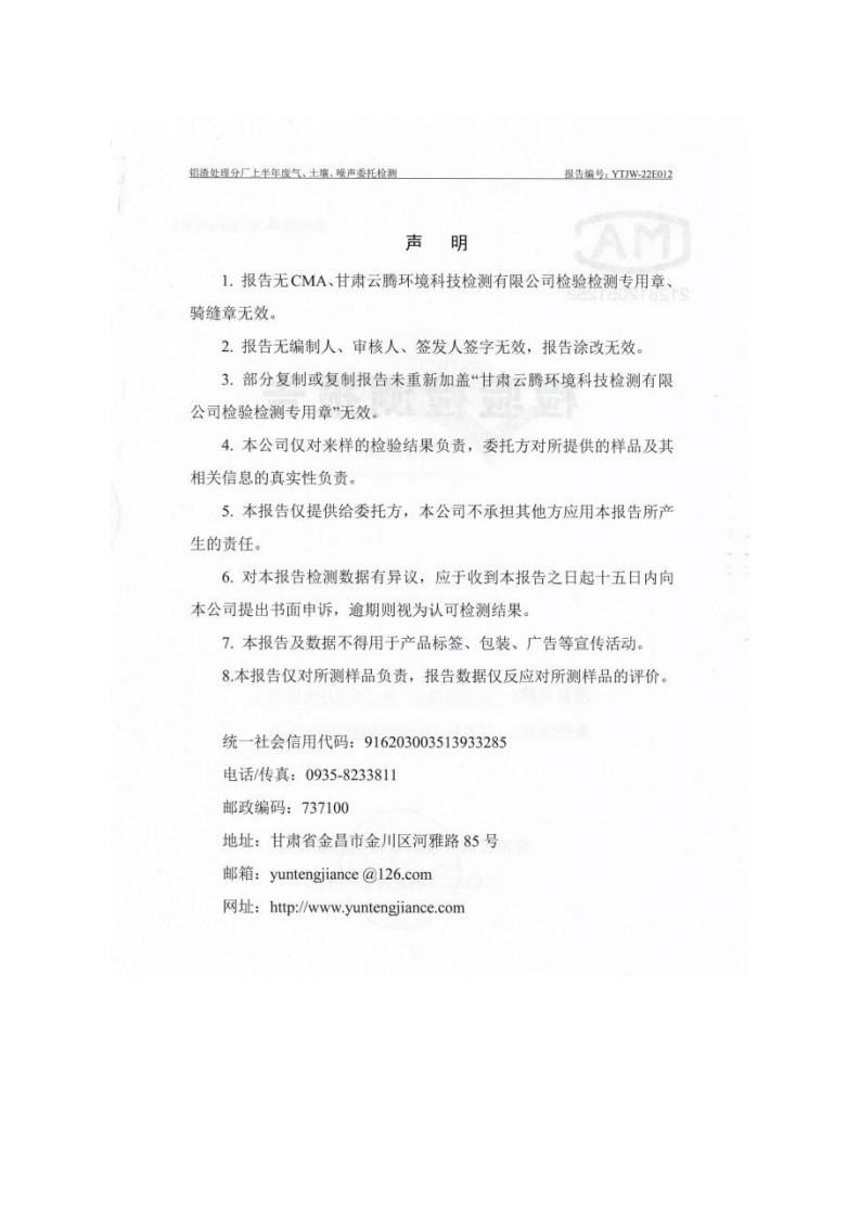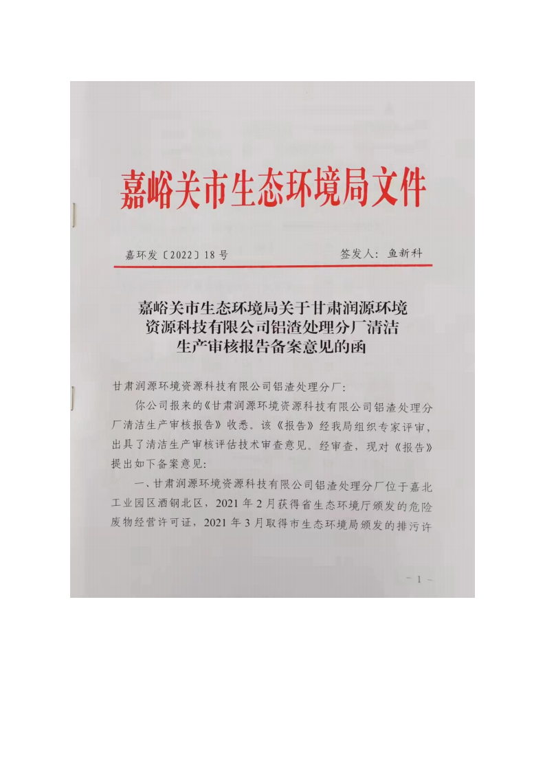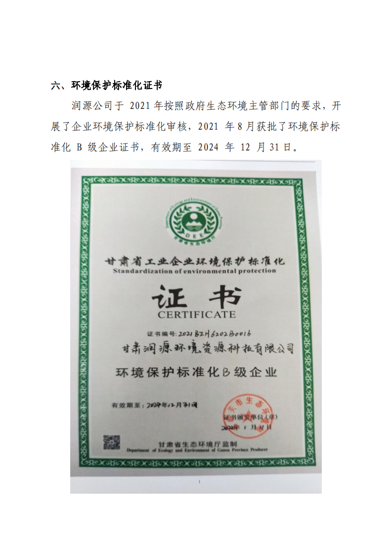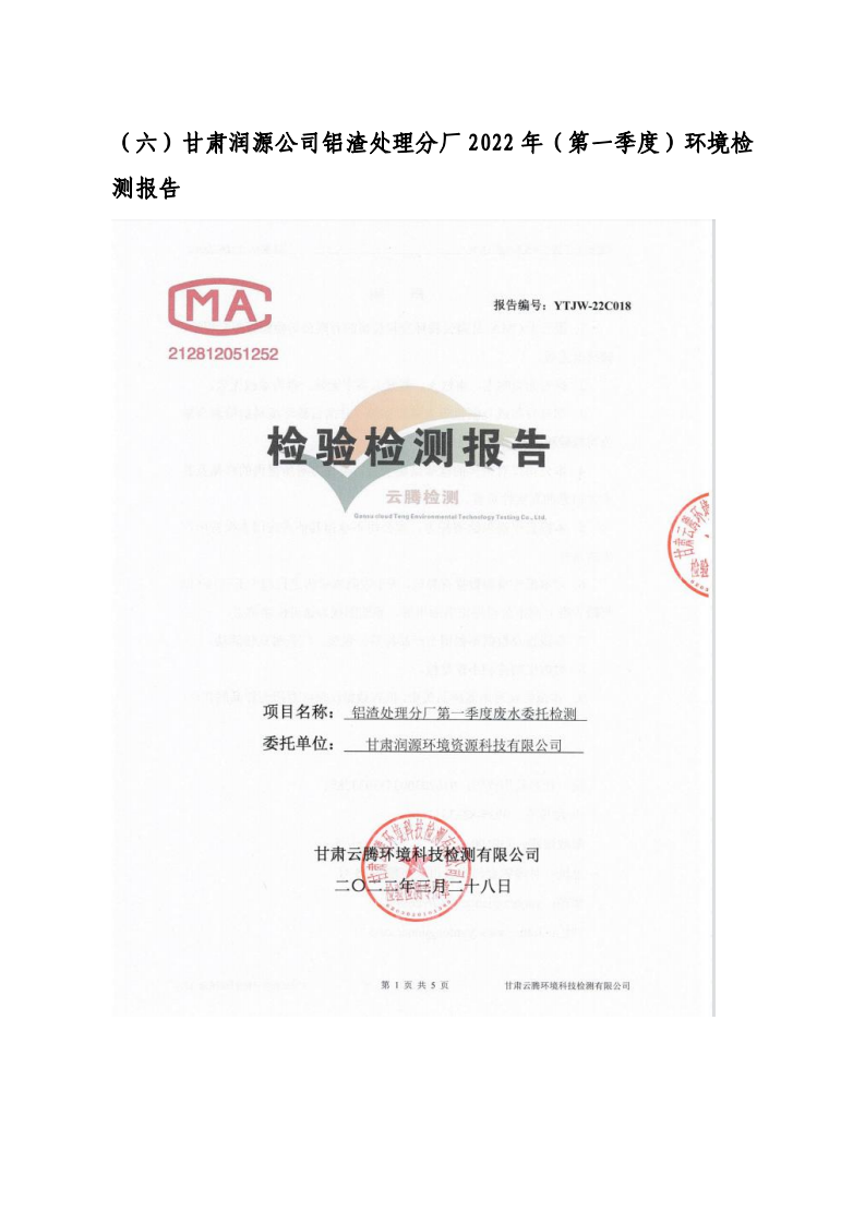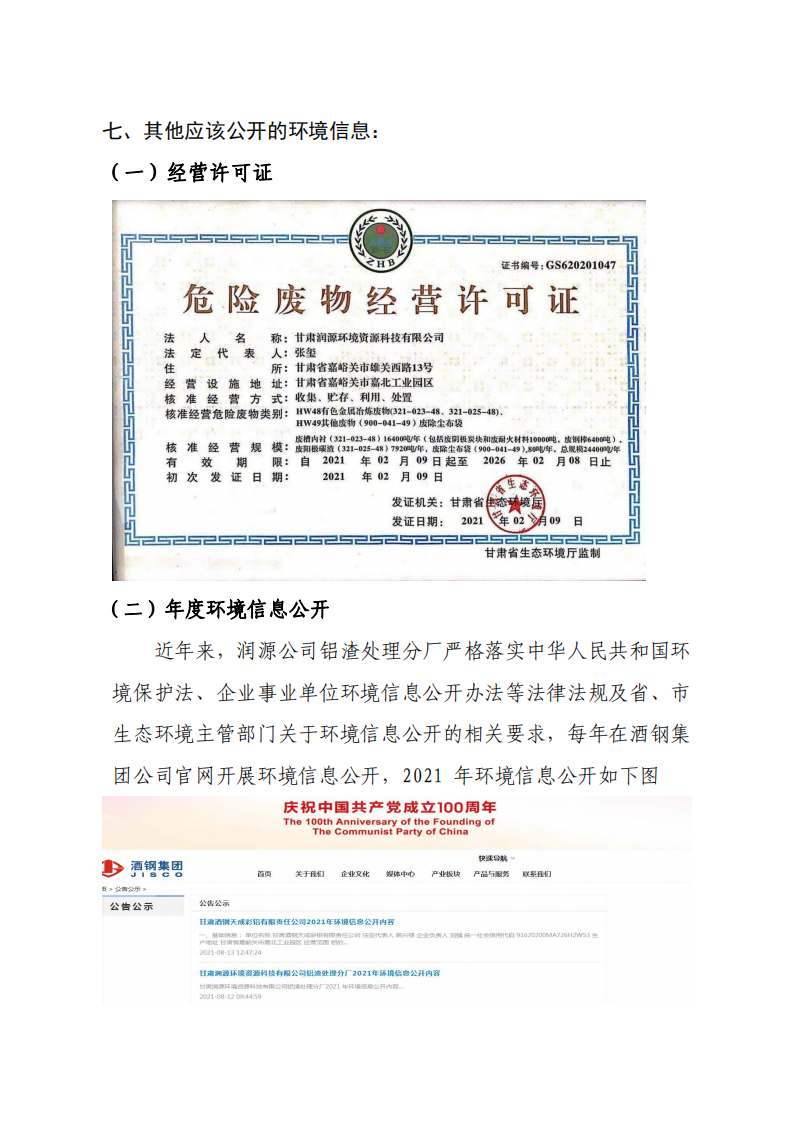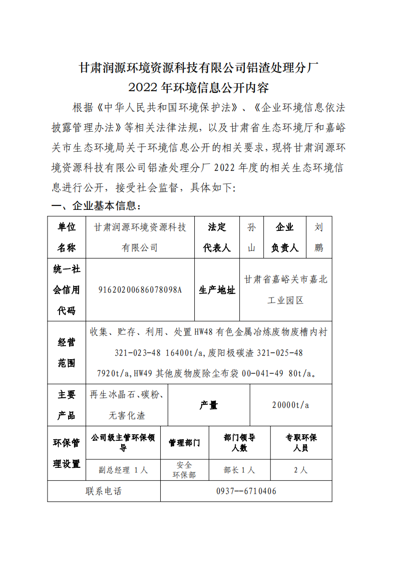 甘肅潤源環(huán)境資源科技有限公司鋁渣處理分廠2022年環(huán)境信息公開