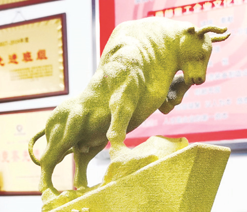 近日,西部重工公司精密鑄造分廠利用3D打印設備成功生產(chǎn)出“三牛”獎杯,彰顯“牛市”動感的形象,受到職工一致好評。該廠相關技術人員以“為民服務孺子牛、創(chuàng)新發(fā)展拓荒牛、艱苦奮斗老黃牛”“三牛精神”寓意為思路,通過設計、數(shù)字建模、打印、固化、上色,成功“打印”出牛氣沖天的雕塑獎杯,用于該公司年度表彰,同時具備批量化、個性化生產(chǎn)的能力?!             ⊥踹M  周永虎  攝