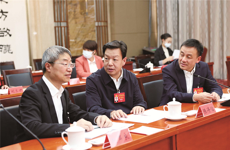 10月18日,出席黨的二十大的甘肅省代表團(tuán)的代表相互交流,認(rèn)真討論。新甘肅·甘肅日?qǐng)?bào)記者 高檣 攝